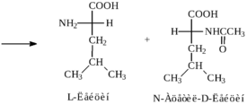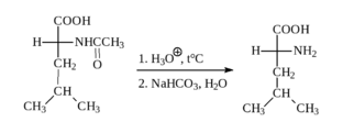 Далее N-ацетил-D-лейцин гидролизуют разбавленным раствором кислоты при нагревании и получают чистый D-лейцин (в виде соли).