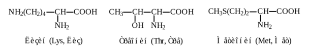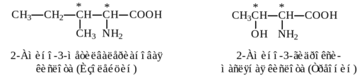 L-Треонин: (2S, 3R)-2-Амино-3-гидроксимасляная кислота или (2S, 3R)-2-Амино-3-гидрокси-бутановая кислота.