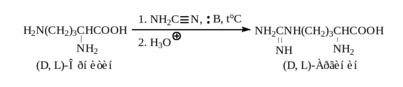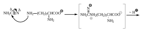 Основание: :B связывает протон карбоксильной группы, после чего следует нуклеофильная атака -NH2-группы (более сильный нуклеофильный центр, чем -аминогруппа) по CN-связи цианамида.