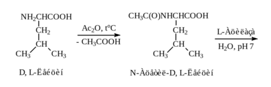 Конечную смесь L‑лейцина и N‑ацетил-D-лейцина можно легко разделить, обработав ее разбавленным раствором кислоты. При этом растворяется L-лейцин. N‑Ацетил-D-лейцин растворяется только в основаниях.