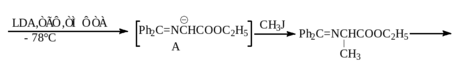 14. Данный метод синтеза рацемических -аминокислот включает стадию генерирования устойчивого аниона А, стабилизация отрицательного заряда в котором осуществляется за счет (-I)- и (-M)-эффектов C=N и COOC2H5 групп. Далее анион А алкилируют, затем продукт алкилирования подвергают кислотному гидролизу.