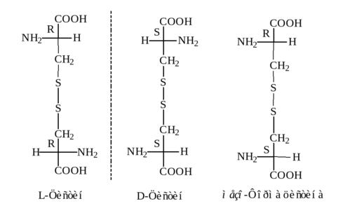 мезо - Форма цистина: (2R, 2’S)-3,3'-дитио-бис-2-аминопропановая кислота.