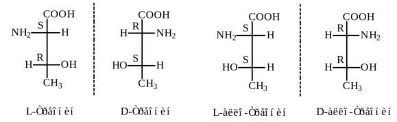 В случае треонина энантиомерные L и Dтреонины представляют собой треоформу, а энантиомерные Lалло и D-алло-треонины представляют собой эритро - форму треонина.