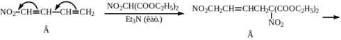 При действии триэтиламина соединения А и Б претерпевают процесс Е2-элиминирования с образованием одного и того же продукта NO2-CH=CH-СH=CH2 (В; 1-нитробутадиен-1,3).