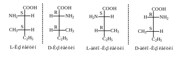 Для молекул с несколькими асимметрическими центрами (атомами) число стереоизомеров в общем случае равно 2n, где n-число асимметрических атомов. В случае изолейцина и треонина число стереоизомеров равно 22, т.е. 4.