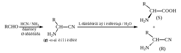 Рацемические -аминонитрилы легко получаются синтезом Штреккера. Их энантиомерный селективный гидролиз в присутствии ферментов нитрилаз имеет большое практическое значение: