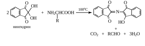 Общая качественная цветная реакция на -аминокислоты – образование соединения сине-фиолетового цвета (max550570 нм) с нингидрином (нингидринная реакция аминокислот).