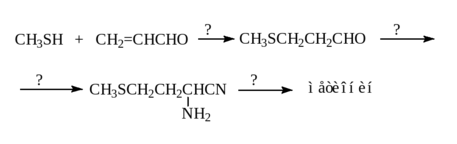 Исходя из метилмеркаптана и акролеина, получите D,L-метионин по приведенной ниже схеме.