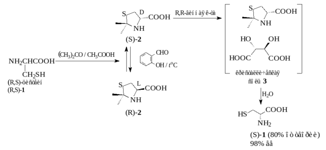 Дерацемизация (R,S)-цистеина может быть осуществлена по следующей схеме.