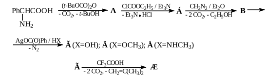 Интересный подход к синтезу -аминокислот заключается в гомоголизации соответствующих -аминокислот по методу Арндта-Эйстерта. Этот метод включает следующие стадии (на примере превращения фенилглицина в гомофенилглицин).