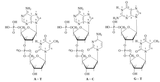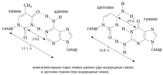 31. Межмолекулярные водородные связи образуются только между определенными парами производных пиримидина и пурина; они называются комплементарными парами. Такими комплементарными парами являются тимин–аденин, цитозин–гуанин и урацил–аденин. Комплементарность спаривания оснований A–T и G–T является ключевой характерной чертой структуры двойной спирали. Только пара пуриновое основание – пиримидиновое основание подходит для структуры спирали. Для двух пуринов недостаточно пространства, а для двух пиримидинов слишком много пространства для образования водородных связей.