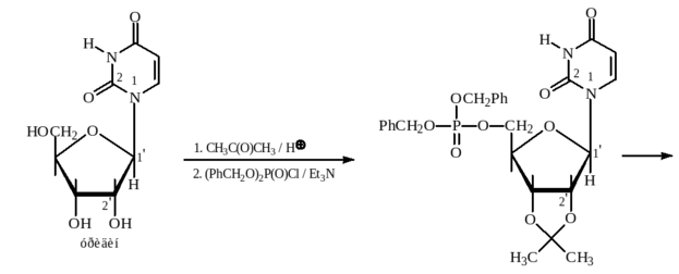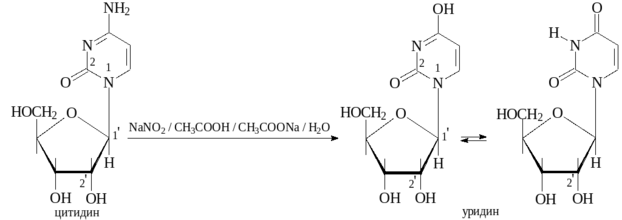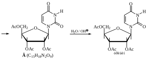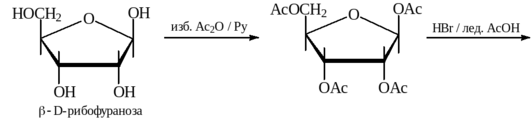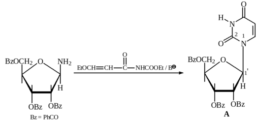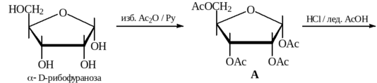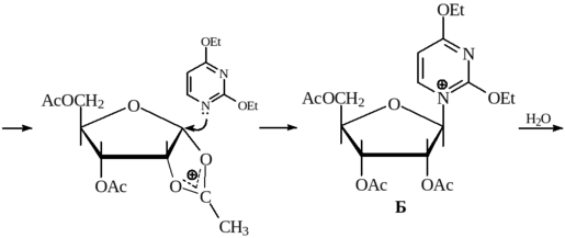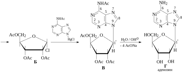 Приведенная цепочка превращений демонстрирует метод синтеза нуклеозидов из аминосахаров.