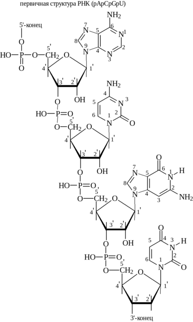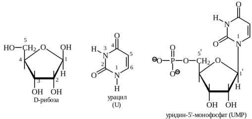 Таким образом, следует указать на два важных отличия РНК от ДНК: 1) в состав РНК входит другой углевод – D-рибоза вместо дезоксирибозы, 2) урацил заменяет тимин в ряду четырех гетероциклических оснований; урацил отличается от тимина только отсутствием метильной группы в положении С-5, как и тимин он образует нуклеотиды по атому азота N-1. В остальном нуклеозиды и нуклеотиды РНК имеют структуры, подобные структурам ДНК.