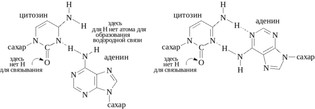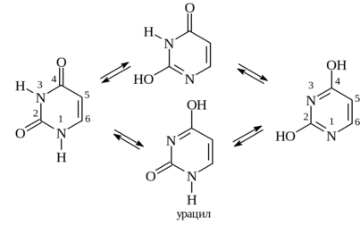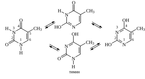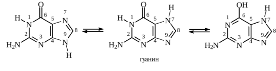 Содержание редких таутомерных форм (имино-таутомеры аденина и гуанина по С-6 и С-2, соответственно, и енольного таутомера гуанина по С-6) не превышает в нормальных условиях 10-3 %.