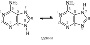 Аденин может существовать в виде двух таутомеров за счет миграции водорода между атомами азота N-7 и N-9 – так называемая азольная прототропная таутомерия.
