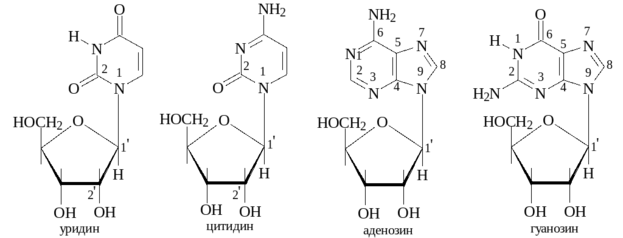 1. Нуклеиновые кислоты (полинуклеотиды) являются биополимерами, которые построены из звеньев нуклеозидов, связанных между собой фосфодиэфирными связями. В свою очередь, нуклеозиды – это N-гликозиды рибозы или дезоксирибозы с пуриновыми или пиримидиновыми основаниями.