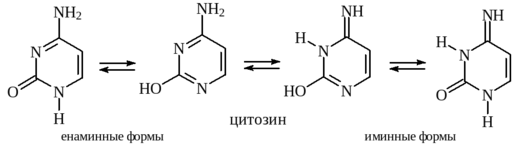 В случае цитозина имеет место как лактим-лактамная таутомерия, так и енамино-иминная таутомерия. Однако преобладающими являются енаминные формы.