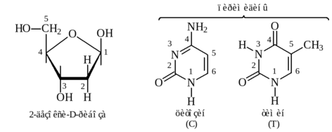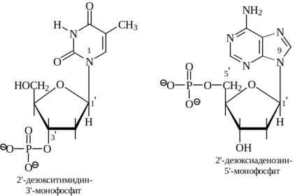 Аббревиатура для названий этих соединений строится так: d ставится для 2-дезокси-D-рибозы, следующая буква относится к сокращению основания, а MP – пишут в случае монофосфата. Для дифосфатов аббревиатура DP, а для трифосфатов – TP. Если нет специального указания, аббревиатура обычно относится к 5’-фосфатам. Поэтому 2’-дезоксицитидинмонофосфат обозначают dCMP, 2’-дезокситимидинмонофосфат – dTMP, 2’-дезоксиаденозинмонофосфат – dAMP и 2’-дезоксигуанозинмонофосфат – dGMP.