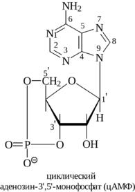 27. Циклический аденозинмонофосфат (цАМФ) осуществляет функции внутриклеточного посредника в действии ряда гормонов и медиаторов (передатчиков) нервного возбуждения. Он является медиатором особой гормональной активности. Когда гормон вне клетки взаимодействует с местом специфической адсорбции на клеточной мембране, это может стимулировать синтез цАМФ внутри клетки. Далее внутри клетки цАМФ регулирует некоторые биохимические процессы. Таким образом, у гормона нет необходимости проникать в клетку, чтобы приводить их в действие.