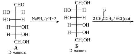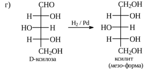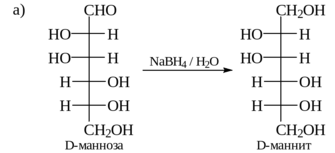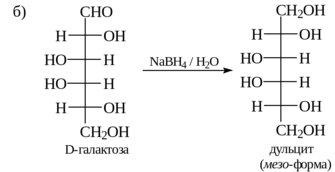 20. Оптически активные гекситы образуются при восстановлении D-маннозы (D-маннит) и D-глюкозы (D-глюцит). При восстановлении D-галактозы образуется оптически неактивный гексит (дульцит); восстановление D-ксилозы дает также оптически неактивный пентит (ксилит).