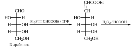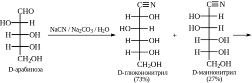 Полученные таким образом D-гептозы не являютя эпимерами, т. к. они отличаются стереохимией не одного, а двух атомов углерода (С-2 и С-3). На первой стадии обычно используют тетраацетат D-арабинозы, оторый легко получается ее нагреванием с уксусным ангидридом.