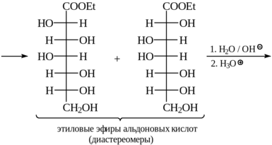 Для получения чистых образцов D-глюкозы и D-маннозы промежуточные диастереомерные альдоновые кислоты разделяют, используя различную растворимость их солей в воде (дробная кристаллизация из воды).