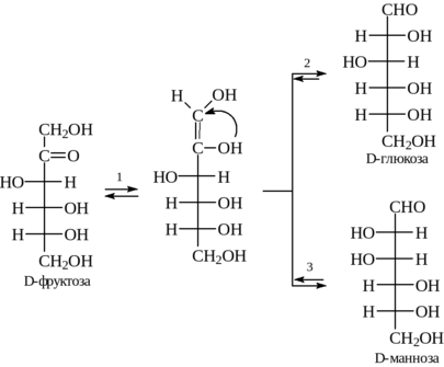 29. В слабощелочной среде при комнатной температуре может происходить изомеризация моносахаридов. Так, в этих условиях D-фруктоза находится в равновесии с D-глюкозой и D-маннозой. Это объясняется катализом в слабощелочной среде кето-енольного превращения D-фруктозы; образующийся ендиол может далее за счет миграции протона гидроксильной группы при атоме углерода C-2 (направление 1) – кетозу (D-фруктозу), а за счет миграции протона гидроксильной группы при атоме углерода C-1 (направления 2 и 3) давать смесь двух альдоз (D-глюкозы и D-маннозы). Эта способность D-фруктозы к переходу в альдозу и определяет необычное свойство ее как кетозы давать реакции, характерные для альдегидной группы, например, положительную пробу Толленса.