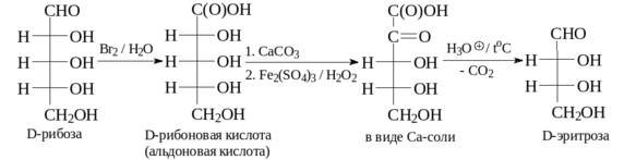 24. При деградации сахаров по Руффу их углеродная цепь уменьшается на один атом углерода. При этом альдегидный атом углерода С-1 исходного сахара удаляется в виде СО2, а его хиральный атом углерода С-2 превращается в ахиральный альдегидный центр (атом углерода С-1 продукта деградации). Основная стадия деградации альдоз по Руффу – это декарбоксилирование промежуточных -кетокислот. Поэтому две эпимерные по положению С-2 D-альдопентозы при деградации по Руффу дают одну и ту же D-альдотетрозу – D-эритрозу. Этому условию отвечают D-рибоза и D-арабиноза.