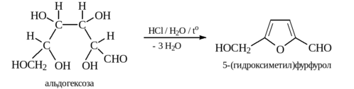 Гидролиз гексоз приводит к 5-(гидроксиметил)фурфуролу.