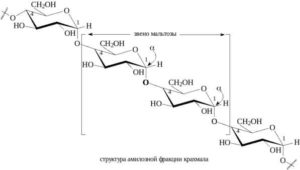 Крахмал является энергосберегающим карбогидратом растений. Это основной компонент зерновых культур, картофеля и риса. Крахмал это форма, в которой глюкоза сохраняется для дальнейшего использования. Звенья глюкозы связаны в крахмале в основном 1,4--гликозидными связями, хотя цепи могут иметь и разветвления, соединенные 1,6-- гликозидными связями. Частичный гидролиз крахмала дает мальтозу, а полный гидролиз – только D-глюкозу. Технически крахмал можно разделить на две фракции: амилозу и амилопектин.