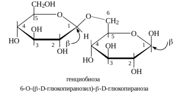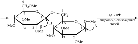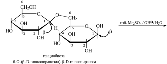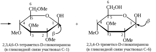 Образование 2,3,4,6-О-тетраметил-D-глюкопиранозы и 2,3,4-О-триметил-D-глюкопиранозы говорит об участии в гликозидной связи гидроксила при атоме углерода С-1 одной молекулы D-глюкозы и гидроксила при атоме углерода С-6 второй молекулы D-глюкозы.