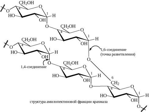 Амилопектин сильно разветвлен. Хотя каждая молекула может содержать 300-5000 звеньев глюкозы, цепей с 1,4-последовательностью в среднем только 25-30 звеньев по цепи. Эти цепи соединяются в точках разветвления за счет 1,6-связывания. Вследствие этой высокой разветвленности в воде гранулы крахмала разбухают и в конце концов образуют коллоидные растворы.