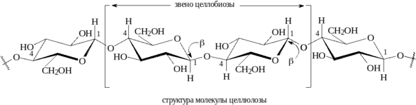 Целлюлоза – неразветвленный полимер глюкозы с 1,4--гликозидной связью. Рентгеноструктурный анализ целлюлозы указывает на то, что она состоит из линейных цепей целлобиозы.