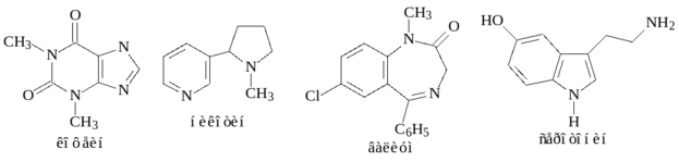 Алкалоиды это природные продукты, которые содержат один или более гетероатомов азота и находятся в листьях, коре, корнях, семенах растений. В качестве примера можно привести кофеин (содержится в листьях чая, в зернах кофе и орехах кола) и никотин (содержится в листьях табака). Хорошо известны два других гетероцикла – валиум (синтетический транквилизатор) и серотонин (нейромедиатор), ответственные за самообладание или эмоциональную устойчивость.