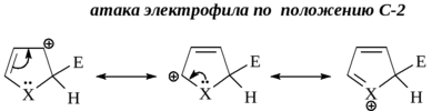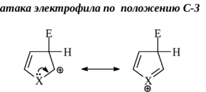 Электрофильная атака в положение С-2 (или в положение С-5) преобладает, так как в этом случае в карбокатионном промежуточном -комплексе положительный заряд может быть делокализован по трем атомам, в то время как атака по С-3 (С-4) дает возможность делокализации только по двум положениям.