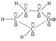 3. Фуран имеет планарную пентагональную структуру, в которой все атомы кольца sp2 гибридизованы. Каждый атом кольца использует две из этих орбиталей для образования связей с соседними атомами кольца. Каждый атом углерода использует одну sp2 орбиталь, давая связь в плоскости кольца с атомом водорода и имеет один электрон на р орбитали, перпендикулярной плоскости кольца. Атом кислорода имеет неподеленную электронную пару на sp2 орбитали в плоскости кольца и два электрона на р орбитали, перпендикулярной плоскости кольца. Эти два электрона перекрываются с электронами на р орбиталях атомов углерода, образуя 6 электронное облако выше и ниже плоскости кольца как в бензоле. Связывание в тиофене и пирроле аналогично.