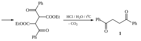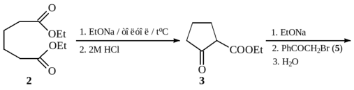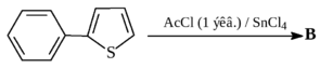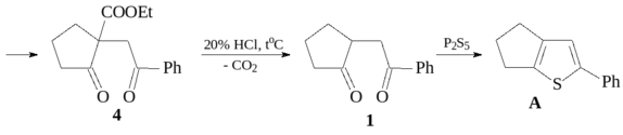 14. Синтез тиофена А по Паалю-Кнорру из ацетофенона и диэтилового эфира адипиновой кислоты. Для получения 1,4-дикетона 1 проводят сложноэфирную конденсацию диэтиладипата (2) по Дикману, алкилирование этилового эфира 2-оксоциклопентанкарбоновой кислоты (3) фенацилбромидом (5) и “кетонное расщепление” эфира 4. Тиофен (А) можно получать также действием H2S / HCl на 1,4-дикетон 1.