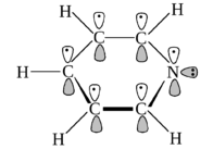 4. Атом азота как и атомы углерода в пиридине sp2 гибридизирован и имеет один электрон на р орбитали, перпендикулярной плоскости кольца. Таким образом, один электрон атома азота вместе с пятью электронами атомов углерода образуют ароматическое облако. Неподеленная электронная пара азота находится на sp2 орбитали, которая лежит в плоскости кольца. Из-за подобия в связывании пиридин схож с бензолом и по строению: он планарен с гексагональной геометрией близкой к идеальной. Подобно бензолу пиридин ароматичен и более склонен к реакциям замещения, чем присоединения. Важное различие между пяти- и шестичленными ароматическими гетероциклами состоит в том, что в пятичленных гетероциклах гетероатом отдает в ароматическую 6 систему два электрона, а в шестичленных – только один. Это различие имеет важные последствия в химическом поведении этих двух типов гетероциклов.