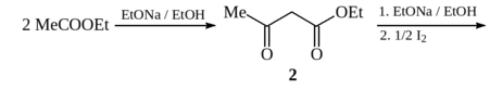 7. Для получения 2,5-диметилфурана (А) из этилацетата необходимо синтезировать 1,4-дикетон – гексан-2,5-дион (1). Синтез включает получение ацетоуксусного эфира (2) конденсацией Кляйзена, сдваивание его енолята под действием иода и “кетонное расщепление” полученного диэфира 3.