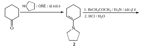 9. Синтез замещенного фурана А из циклогексанона, пирролидина и бромацетона. Исходный 1,4-дикетон 1 получают, используя алкилирование енамина циклогексанона 2 бромацетоном.