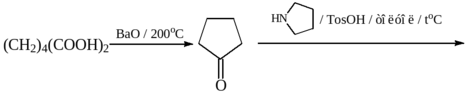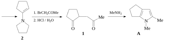 11. Синтез соединения А, исходя из адипиновой кислоты, бромацетона и метиламина. Циклопентанон получают сухой перегонкой бариевой соли адипиновой (гександиовой) кислоты. Для получения 1,4-дикетона 1 применяют алкилирование енамина 2 бромацетоном