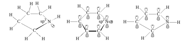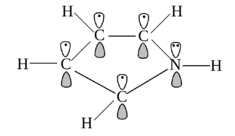5. Пирролидин является циклическим вторичным амином. Пиридин – третичный амин, но он является существенно более слабым основанием (рКа = 5.29), чем алифатические амины (рКа 10). Это связано, в основном, с различной гибридизацией атома азота: sp2 – в пиридине, sp3 – в алифатических аминах. Больший s характер (⅓ s – в пиридине, ¼ s – в алифатических аминах) приводит к тому, что неподеленная пара удерживается прочнее ядром атома азота в пиридине, понижая его основность. В пиридине неподеленная электронная пара не является частью ароматической системы и доступна для присоединения протона. Хотя по структурным критериям пиррол – амин, его основность приблизительно в 1010 меньше, чем у пиридина. В пирроле неподеленная электронная пара азота является частью ароматической 6 электронной системы.