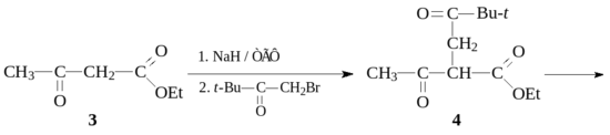 8. Для получения 2-трет-бутил-5-метилфурана (А) сначала из ацетоуксусного эфира и пинаколина (3,3-диметилбутан-2-она) синтезируют 1,4-дикетон – 6,6-диметилгептан-2,5-дион (1): бромирование пинаколина, алкилирование ацетоуксусного эфира (3) бромкетоном 2, “кетонное расщепление” диэфира 4.