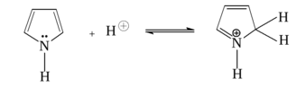 Протонирование атома азота разрушило бы ароматическую систему с потерей ее энергии резонанса. Следовательно, пиррол – очень слабое основание; более того – в очень сильных кислотах он протонируется по атому углерода, а не по атому азота.