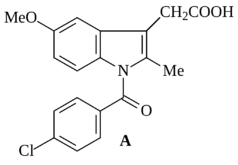 62. Индометацин (А) является нестероидным препаратом, который применяется при лечении артритов, тромбофлебита и т. д. Синтезируйте это соединение, исходя из п-анизидина (п-метоксианилина), метилового эфира левулиновой (4-оксопентановой) кислоты и п-хлорбензойной кислоты.