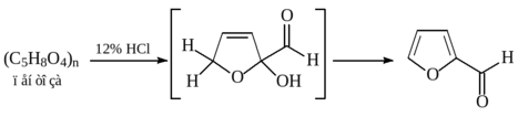 6. Реакция, происходящая при синтезе фурфурола (быстро темнеющей жидкости с запахом ржаного хлеба) из кочерыжек кукурузных початков, представляет собой гидролиз полисахаридов (содержатся также в оболочке семян овса, капусте), имеющих пентозные фрагменты.
