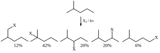 35. Учитывая приведенные ниже данные результата свободнорадикального галогенирования 2-метилпентана, рассчитайте относительную реакционную способность 1°/2°/3°, если реакционная способность первичных водородов принята за единицу.