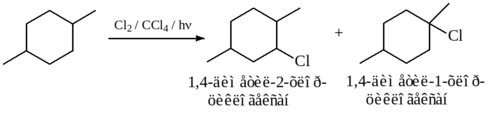 30. Учитывая тот факт, что водороды при третичном атоме углерода (водороды 3о) в 1.5 раза более активны по сравнению с атомами водорода при вторичном атоме углерода (водороды 2о), определите процентное содержание 1,4-диметил-1-хлорциклогексана, который образуется в приведенной ниже реакции.