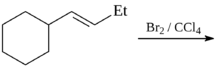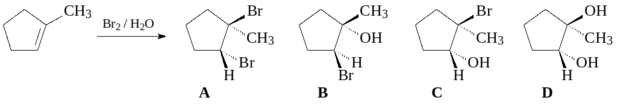 54. Предложите структуру продукта следующей реакции. Укажите стереохимию продукта, основываясь на том, что результаты этой реакции подтверждают транс-присоединение брома за счет образования в качестве интермедиата бромониевого иона.