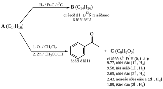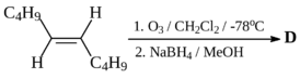 85. Два алкена A и B имеют одинаковую молекулярную формулу С5Н10, дают один и тот же алкан при обработке H2 / Pt и один и тот же спирт при действии Н2О / Н+. Однако они дают различные спирты при обработке ВН3 / ТГФ и далее Н2О2 / NaOH / Н2O. Действие на алкен А О3 и последующая обработка Zn / CH3COOH приводит к двум карбонильным соединениям С (С3Н6О) и D (С2Н4О), данные спектров ЯМР 1Н которых приведены ниже.